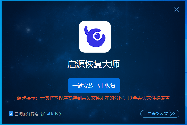 点击下方按钮下载并安装启源数据恢复软件。注意: 请勿将软件安装至数据丢失的磁盘中,以避免数据覆盖。